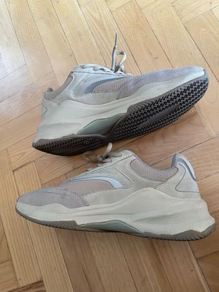 Zapatillas deportivas de Zara en color beige y gris. Diseño moderno y cómodo. - Parte superior de malla y ante. - Suela de goma con buen agarre. - Cierre con cordones.