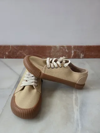 Zapatillas de Zara con un diseño moderno y cómodo. - Combinación de colores beige y blanco. - Cierre con cordones. - Detalle de ante en la puntera y talón. - Tallan amplio, yo tengo un 38 y tuve que comprarme un 37.