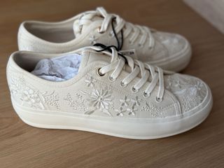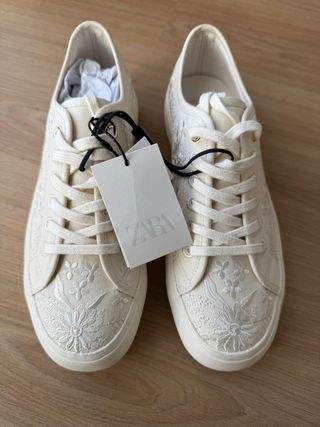 Calzado deportivo de Zara con un delicado bordado floral. Cierre mediante cordones. Acabado en punta redonda. Color crudo - beige Altura de la suela: 2 cm A estrenar con etiquetas.