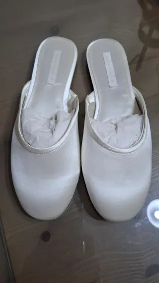 Elegantes zapatillas de Zara Home, perfectas para novias o cualquier ocasión especial, damas de honor u acompañantes. - Diseño abierto tipo mule. - Acabado satinado. - Detalle de etiqueta en la plantilla. Como se ve, nunca se llegaron a usar, como nuevas sin su etiqueta.