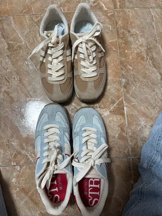 Pack de dos pares de zapatillas deportivas. - Un par en tonos beige y ante. - Otro par en tonos azul claro con detalles rojos.