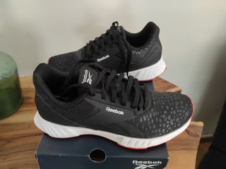 Zapatillas deportivas Reebok con un diseño moderno. - Combinación de colores negro y rojo. - Talla 38.