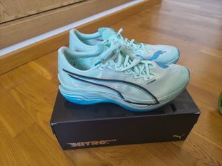 Zapatillas de running Puma Nitro Elite 3 Carbono.. en color azul y verde azulado. Solo usadas 8 km para ver si me valia la talla .valen 220 nuevas - Diseño moderno y ligero. - Tecnología Nitro Elite para mayor amortiguación. - Parte superior de malla transpirable.