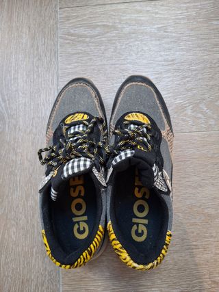 Zapatillas de la marca Gioseppo con un diseño llamativo. - Combinación de colores negro y amarillo. - Detalle de estampado animal en el talón. - Cordones a cuadros blancos y negros. Usadas un par de veces