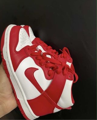 Zapatillas altas de estilo clásico con una combinación de colores llamativa. - Diseño icónico de Nike. - Combinación de cuero rojo y blanco.