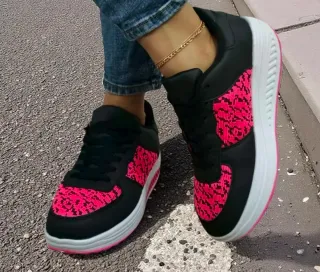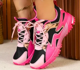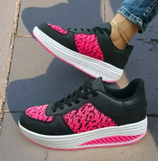 Zapatillas deportivas con un diseño moderno y llamativo. - Combinación de negro y rosa vibrante. - Suela gruesa y cómoda. - Cierre con cordones. Nuevas sin caja talla 35