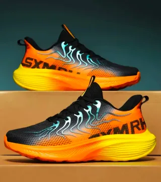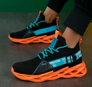 Zapatillas deportivas con un diseño moderno y llamativo. - Parte superior de malla transpirable. - Suela de goma con detalles naranjas. - Cierre de cordones. Nuevas sin caja, talla 39