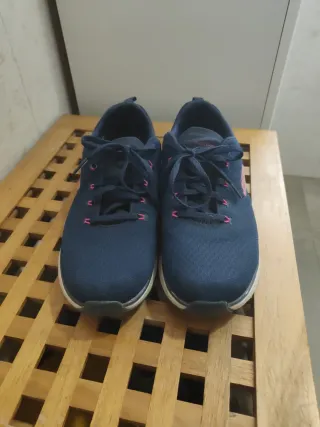 Zapatillas deportivas Skechers con un diseño moderno. Talla 40 que equivale a 41 que es el número que uso. - Parte superior de malla transpirable. - Detalle de cordones y ojales en color rosa. - Suela cómoda para el día a día.