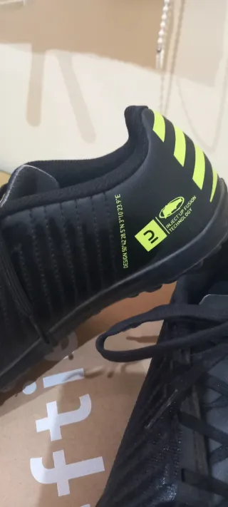 Zapatillas deportivas con suela multitacos, ideales para entrenamientos en césped artificial. - Diseño moderno con detalles en verde. - Cierre con cordones negros. - Material sintético resistente.