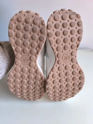 Zapatillas deportivas con un diseño moderno y llamativo. Es nueva sin abrir . - Combinación de colores beige y morado. - Detalles de franjas moradas. - Cordones blancos. - Tobillera dorada con cascabeles.