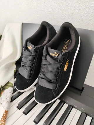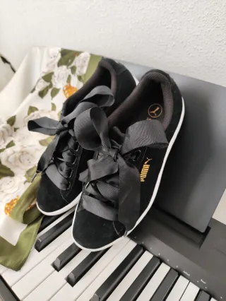 Zapatillas deportivas Tenis. Marca Puma. Modelo Vikky Ribbon. Textura ante con cordones de satén. Color negro. Plantilla softfoam conform. N° 38. Woman. Usadas una sola vez. Lo vendo porque me queda pequeño.