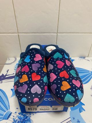 Comodísimas zapatillas de casa con un alegre diseño de corazones. - Estampado de corazones multicolores sobre fondo azul marino. - Forro interior suave para mayor confort. - Suela antideslizante. sin usar las vendo , por que no le gustan a quien se las compre