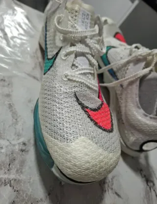 Zapatillas de atletismo Nike Air Zoom Victory con clavos. - Diseño en blanco con detalles en rosa y turquesa. - Parte superior de malla transpirable. - Cierre con cordones blancos.