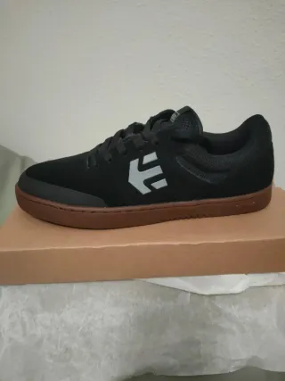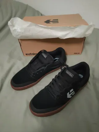Zapatillas de skate Etnies Marana en color negro con suela marrón. No han pisado la calle. Fue un antiguo pedido a EEUU y la devolución fue imposible. - Reforzadas. - Parte superior de ante y malla. - Suela de goma vulcanizada. - Muy buen grip. - Modelo de 2015.