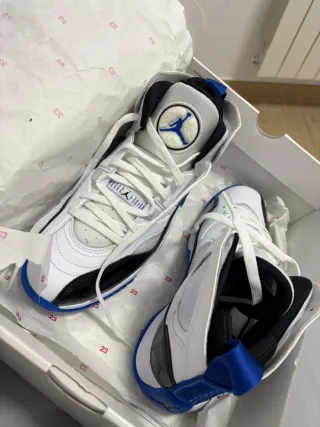 Zapatillas deportivas Jordan con un diseño moderno y llamativo. - Combinación de colores blanco y azul. - Detalle del logo Jordan en la lengüeta. - Suela con detalles en azul.