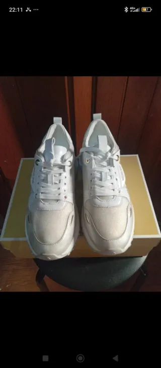 Zapatillas de moda Michael Kors para mujer. - Diseño moderno en blanco y dorado. - Detalle del logo MK en los laterales. talla 6.5 igual a 37 no lleva su caja
