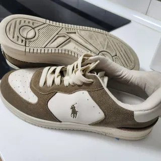 Zapatillas Polo Ralph Lauren en tonos beige y marrón, casi sin uso. - Diseño deportivo. - Logo del jinete bordado. - Suela de goma.