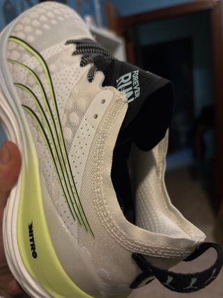 Zapatillas deportivas Puma Forever Run Nitro con un diseño moderno y llamativo. - Combinación de colores blanco y amarillo. - Detalle de líneas deportivas en verde lima. - Suela con tecnología NITRO.