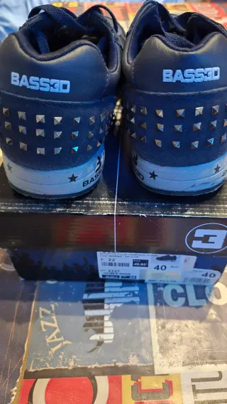 Zapatillas deportivas de la marca BASS30 en talla 40. Combinan tonos azules y plateados con un diseño moderno. - Detalle de tachuelas en el talón. - Cordones a tono. - Suela con inscripciones.