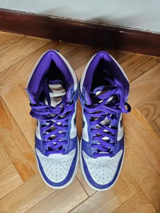 Zapatillas altas de estilo urbano. - Combinación de colores morado y blanco. - Diseño clásico de Nike. - Cordones morados a juego. -Como nuevas y cómodas