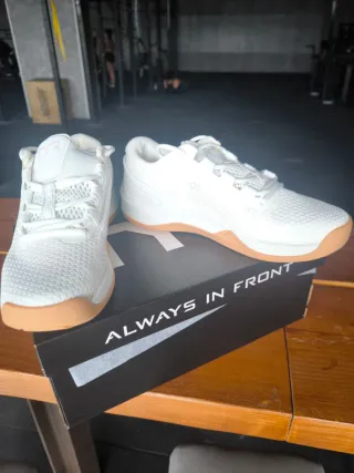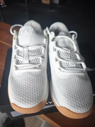Zapatillas deportivas de entrenamiento, ideales para CrossFit. - Talla W5.5 - Diseño moderno en color blanco. - Suela de goma en tono marrón.