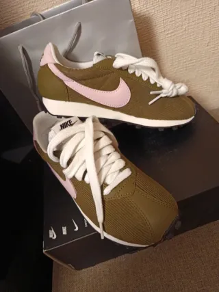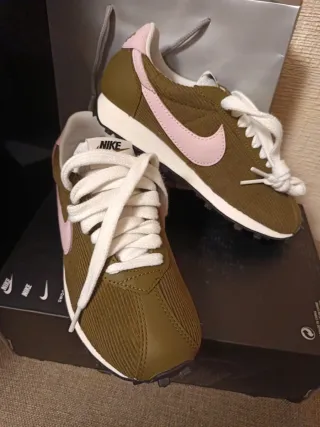 Zapatillas deportivas Nike con un diseño moderno y llamativo. - Combinación de colores verde oliva y rosa. - Logo de Nike en el lateral.