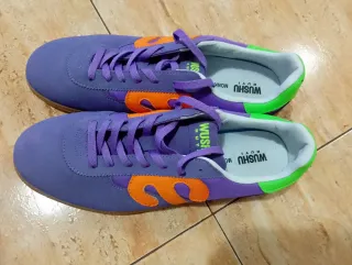 Zapatillas deportivas de estilo urbano con un diseño llamativo. - Exterior de ante morado. - Detalle lateral en naranja. - Talón en verde brillante. - Cordones morados. - Suela de goma marrón.