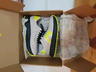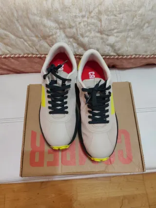 Zapatillas de la marca Camper con un diseño moderno y detalles llamativos. Hago un inciso. Son 42 pero Creo qe viene mejor a un pie del 41. Oh resulta qe m engordo el pie !!!! - Combinación de colores beige y amarillo. - Cordones negros. - Suela con detalles en amarillo.