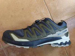 Zapatillas de montaña Salomon en tonos grises y verdes. Perfectas para senderismo y actividades al aire libre. - Diseño deportivo y resistente. - Cierre rápido con cordones. - Suela con buen agarre.