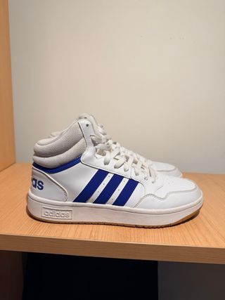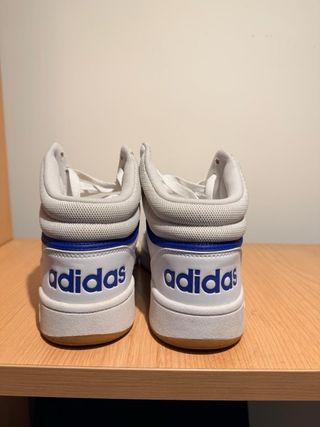 Zapatillas de caña media Adidas Hoops Mid 2.0 en color blanco con detalles en azul. - Diseño clásico de tres rayas. - Cierre de cordones. - Logo de Adidas en el lateral y la lengüeta.