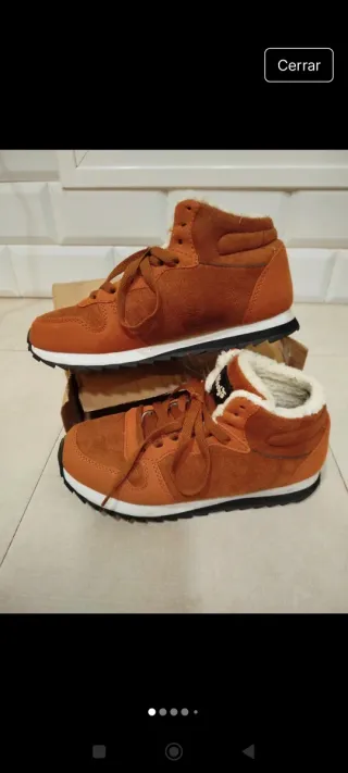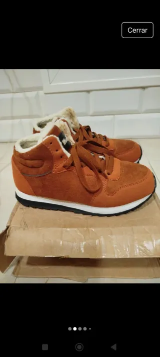 Zapatillas deportivas de caña alta con un cálido forro interior. Está tallada con un 37, pero es como una talla 36. Es de una marca cara. - Exterior imitación ante. - Cierre con cordones. - Suela de goma.