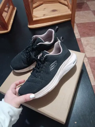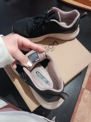 Zapatillas deportivas Skechers en color negro con detalles en rosa. - Diseño moderno y ligero. - Cierre con cordones. - Suela de goma para mayor agarre. - Plantilla memory foam Talla 36, 23 cm de largo. Precio no negociable.