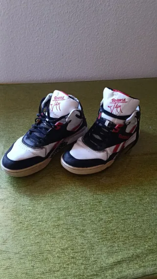 Zapatillas deportivas Reebok Reverse Jam de estilo vintage. Combinan blanco y negro con detalles en rojo. - Diseño de caña alta. - Cordones negros. - Lengueta grande.