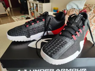 Zapatillas de entrenamiento Under Armour Tribase Reign 6. - Talla 47'5 (la app no me deja poner la talla exacta) - Diseño en negro con detalles en rojo/naranja. - Parte superior de malla transpirable. - Suela de goma para mayor agarre. Completamente nuevas y en perfecto estado. Se venden por necesitar una talla más y extravío de ticket.