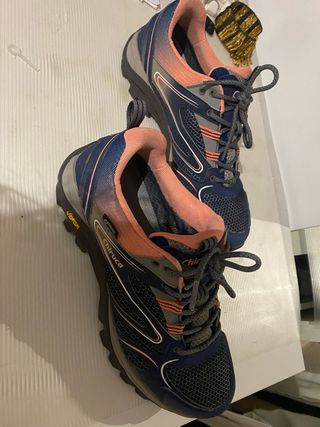 Zapatillas de montaña Chiruca para mujer, diseñadas para ofrecer comodidad y protección - Membrana Gore-Tex para impermeabilidad y transpirabilidad. - Suela Vibram para un agarre óptimo. - Combinación de colores azul y rosa.