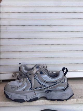Zapatillas de estilo urbano con plataforma. - Diseño bicolor en azul y blanco. - Cierre con cordones. - Suela gruesa y cómoda. Las compré grandes y no las he podido utilizar más allá de una vez. Están prácticamente nuevas.