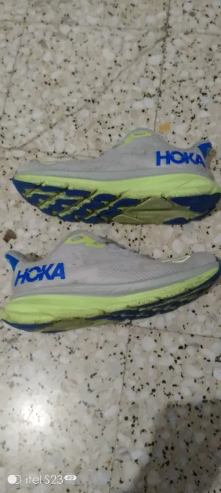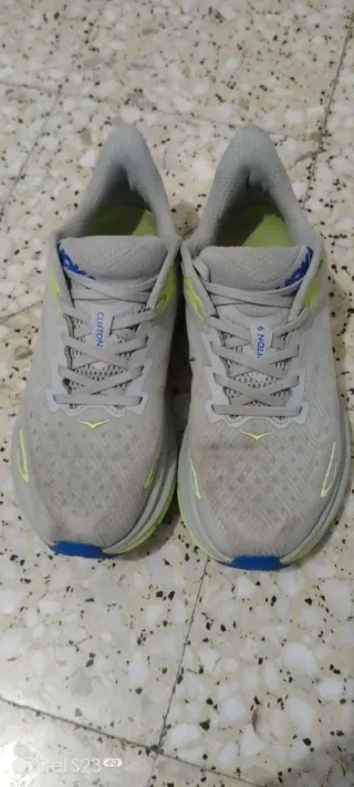 Zapatillas deportivas Hoka Clifton 9 en color gris con detalles en azul y amarillo lima. Diseñadas para ofrecer comodidad y rendimiento. - Modelo: Clifton 9 - Color: Gris, azul, amarillo lima - Cierre: Cordones - Suela: Goma