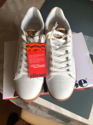 Zapatillas de la marca Ellesse en talla 42. - Diseño en color blanco con detalles dorados. - Suela de goma marrón.