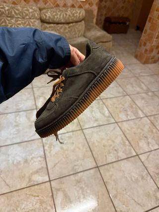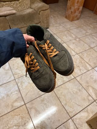 Zapatillas de estilo casual en color verde militar. - Poco uso, por estar pequeñas. - Seminuevas. - Detalle en el talón. - Suela de goma.