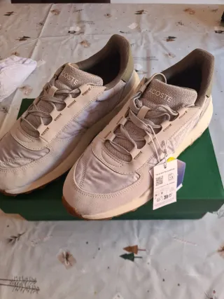 Zapatillas deportivas de la marca Lacoste en tonos beige y blanco. - Diseño moderno y versátil. - Detalles de la marca visibles.