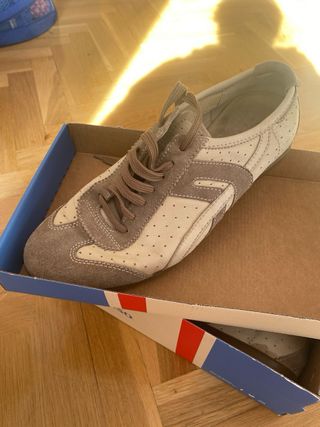 Zapatillas en tonos blanco y beige. - Diseño clásico. - Cierre con cordones. - Detalle de la V en el lateral. puesta muy poco talla 38 no tengo la caja tipo veja