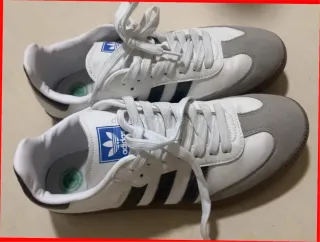 Zapatillas Adidas Samba OG en talla 45. Un clásico atemporal con un diseño icónico. - Combinación de cuero blanco y ante gris. - Tres rayas negras características de Adidas. - Suela de goma. - Detalle del logo Adidas en la lengüeta.