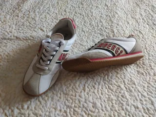 Zapatillas blancas de lona estilo informal. Talla 41. Se han usado 2 veces, se venden por equivocación en talla a la hora de comprarlas. - Color blanco con detalles grises en ante y azul y rojo en lona. - Cierre de cordones. - Suela de goma.