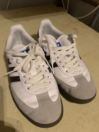 Zapatillas Adidas Samba OG, ideales para uso diario. - Diseño clásico con detalles en gamuza. - Combinación de colores gris y blanco. - Talla 37 1/3.