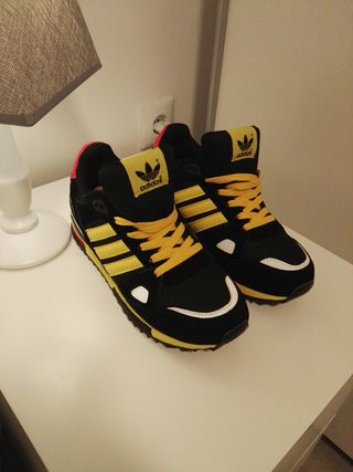 Zapatillas deportivas Adidas con un diseño llamativo. - Combinación de colores negro y amarillo. - Cordones amarillos. - Detalle de las tres rayas características de la marca.