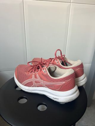 Zapatillas deportivas ASICS en tonos rosas y blancos. Perfectas para correr o para el día a día. - Diseño moderno y ligero. - Suela con tecnología AmpliFoam para mayor amortiguación.
