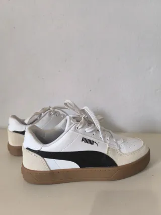 Zapatillas deportivas Puma con un diseño moderno y versátil. - Combinación de cuero blanco y ante beige. - Detalle de franja lateral negra. - Suela de goma marrón.