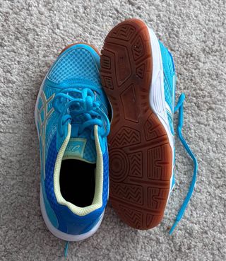 Zapatillas deportivas para fútbol sala con un diseño llamativo. -Usadas 1 vez. - Exterior brillante en tonos azules. - Detalles en verde lima. - Cordones azules. - Suela de goma sin un desgaste.