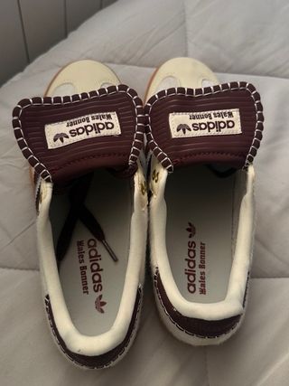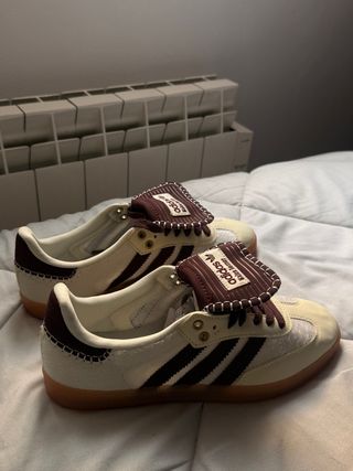 Zapatillas Adidas Samba en colaboración con Wales Bonner. Un diseño único que combina estilo y comodidad. - Parte superior de cuero y ante. - Detalles de costura visibles. - Suela de goma. - Logo de Adidas y Wales Bonner.