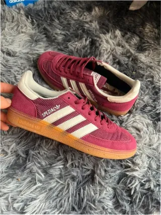 Zapatillas Adidas Handball Spezial en color rojo borgoña y suela de goma. - Diseño clásico de Adidas. - Detalle de las tres rayas blancas. - Etiqueta 'Spezial' en el lateral.